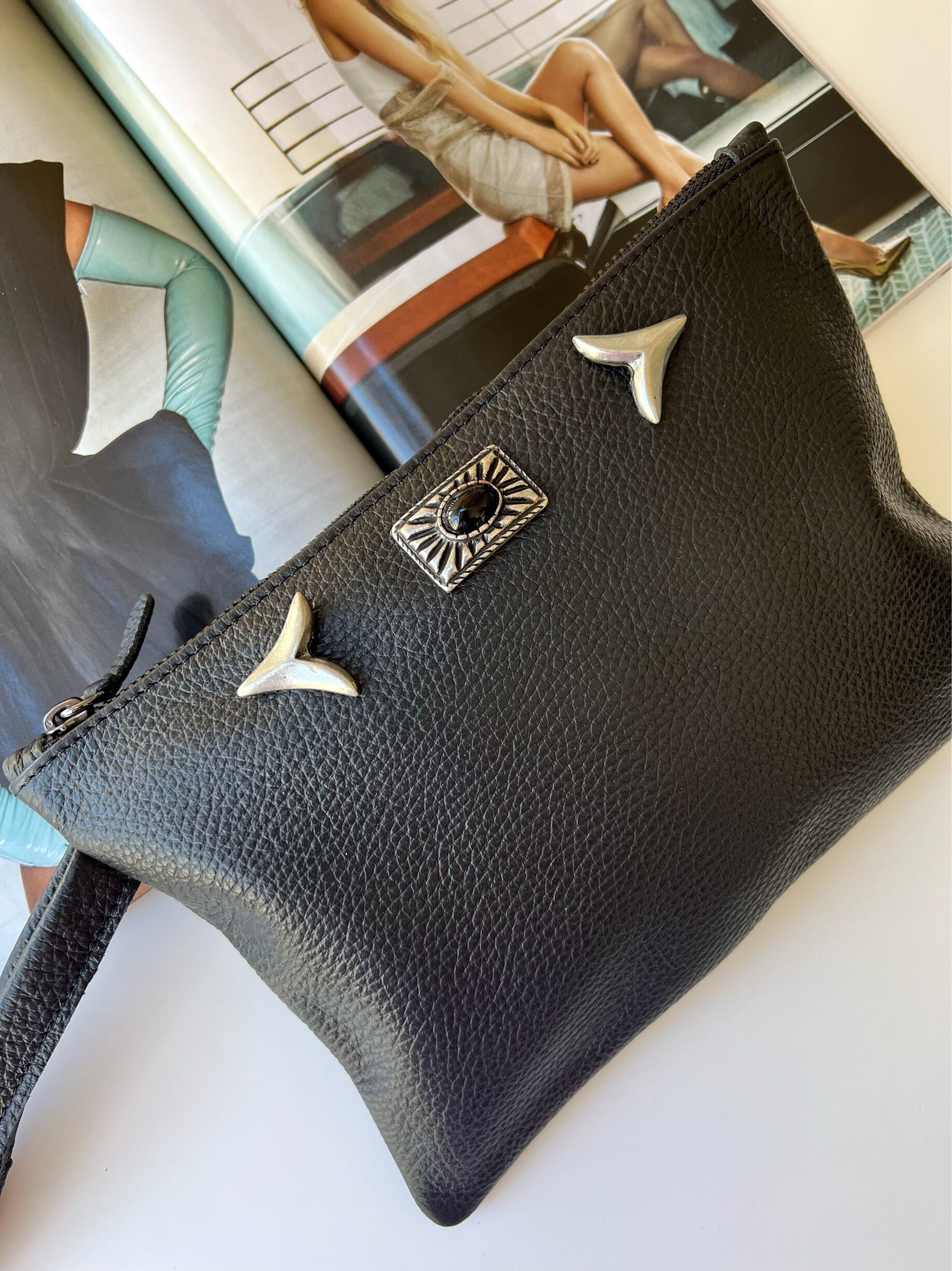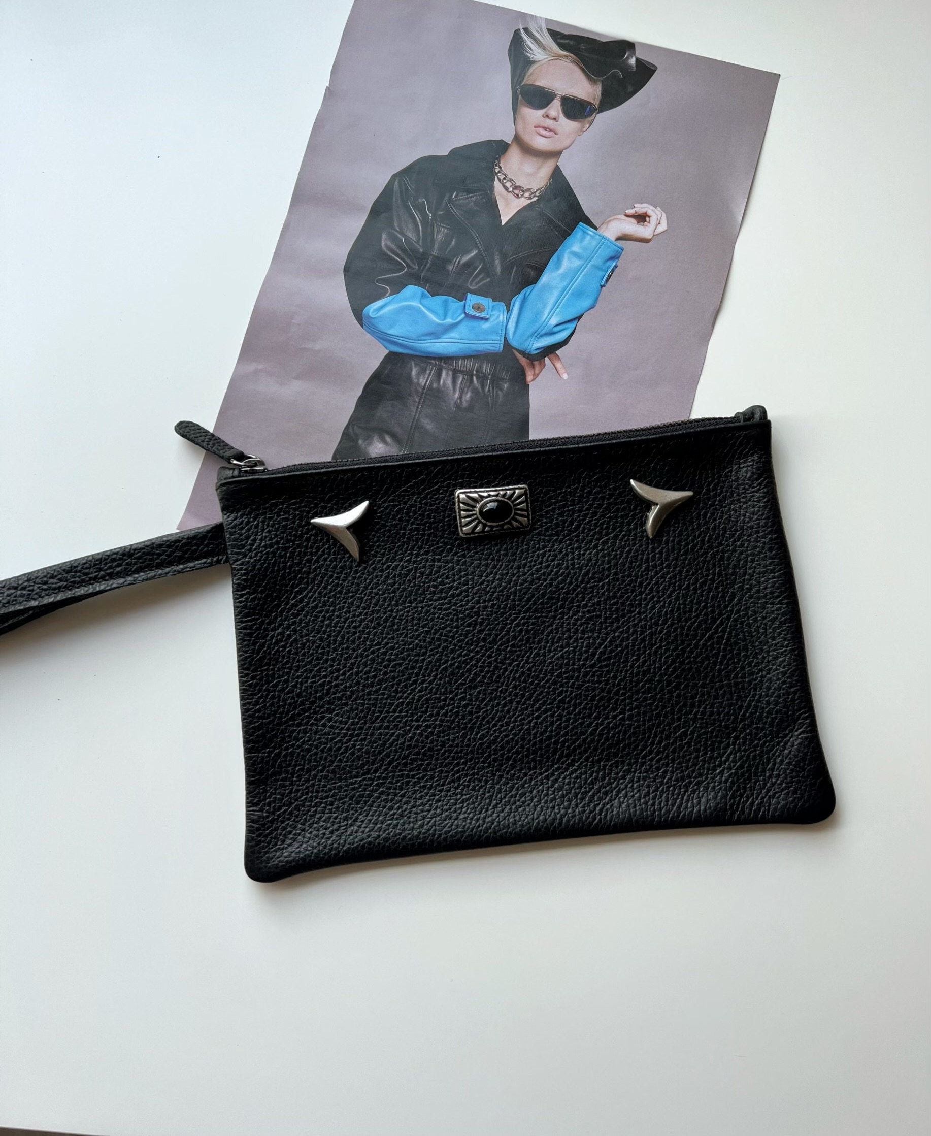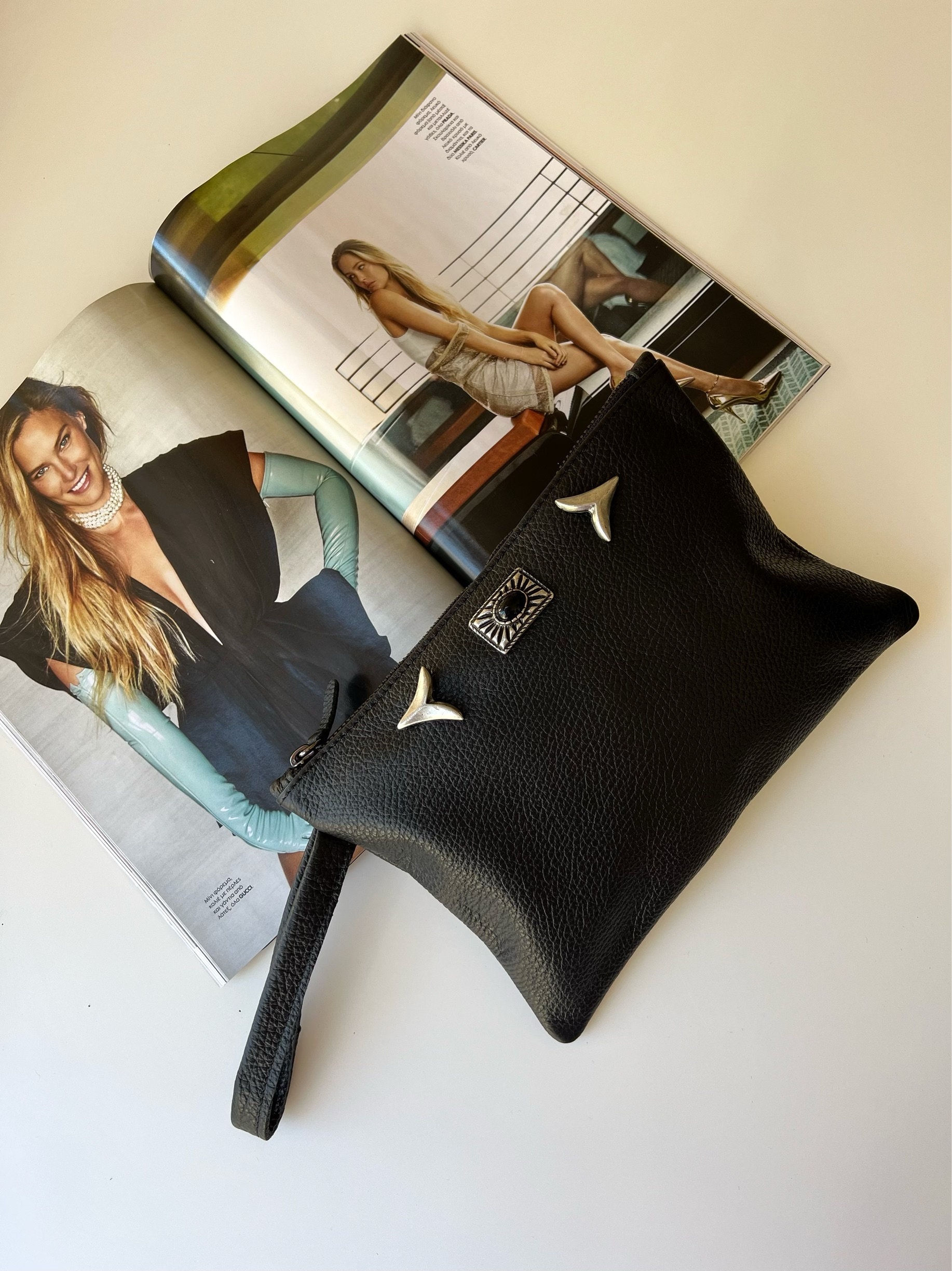 A Black Leather Clutch that is made from Full Grain Leather in black color with minimal silver buckles who create a really boho result. The interior is single and spacious and you can use it everywhere and everyday as a small bag or a bigger wallet that will make your life easier and stylish at the same time. Choose it and make the difference. Find them only at our Store.