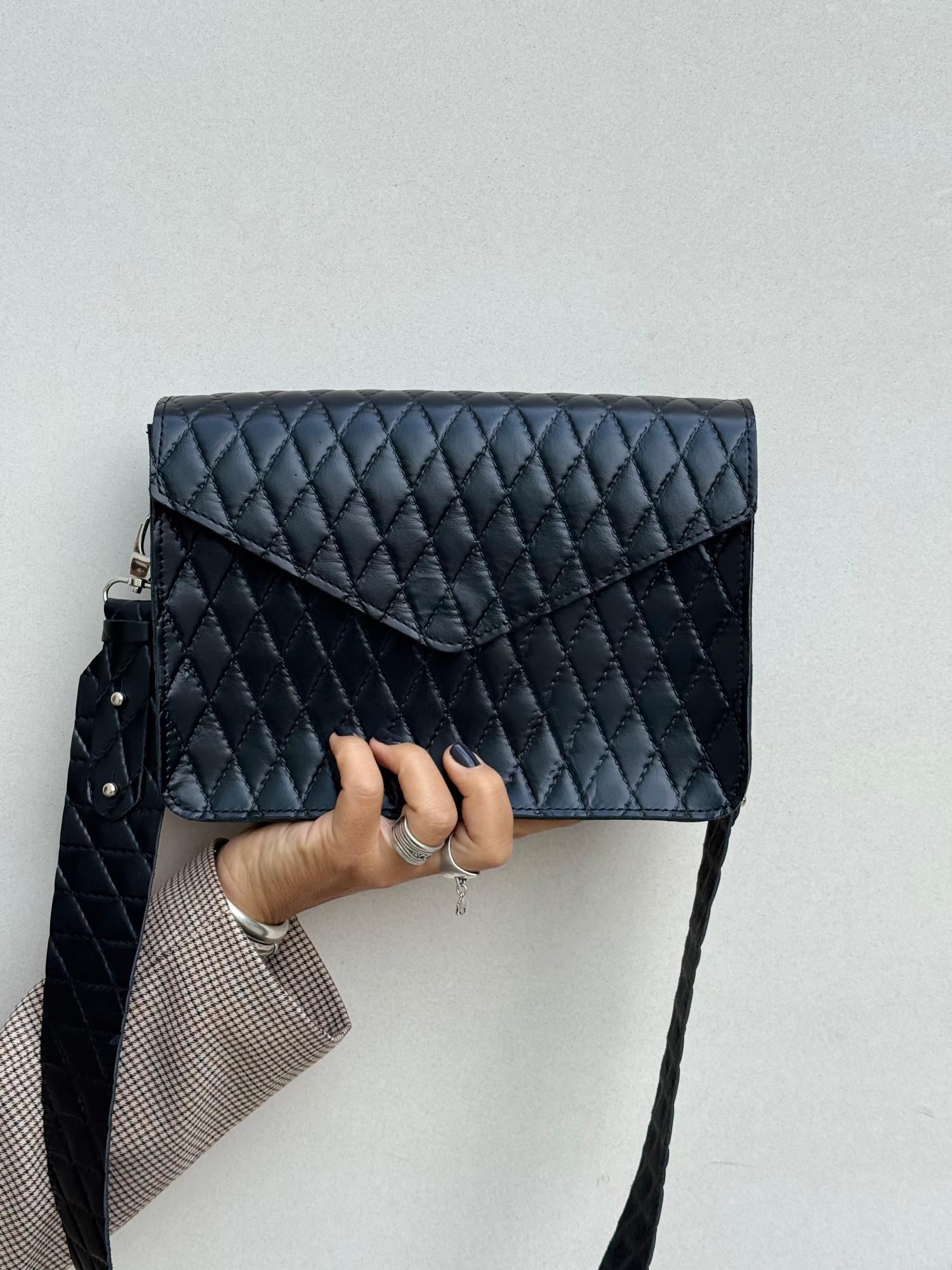 This handmade crossbody bag is crafted from luxurious full grain leather in a quilted pattern. It features an elegant enamel stone clasp, silver Zamak buckles, and a zip pocket at the back. Designed , it offers one spacious compartment and a slightly adjustable leather strap for modern everyday elegance.